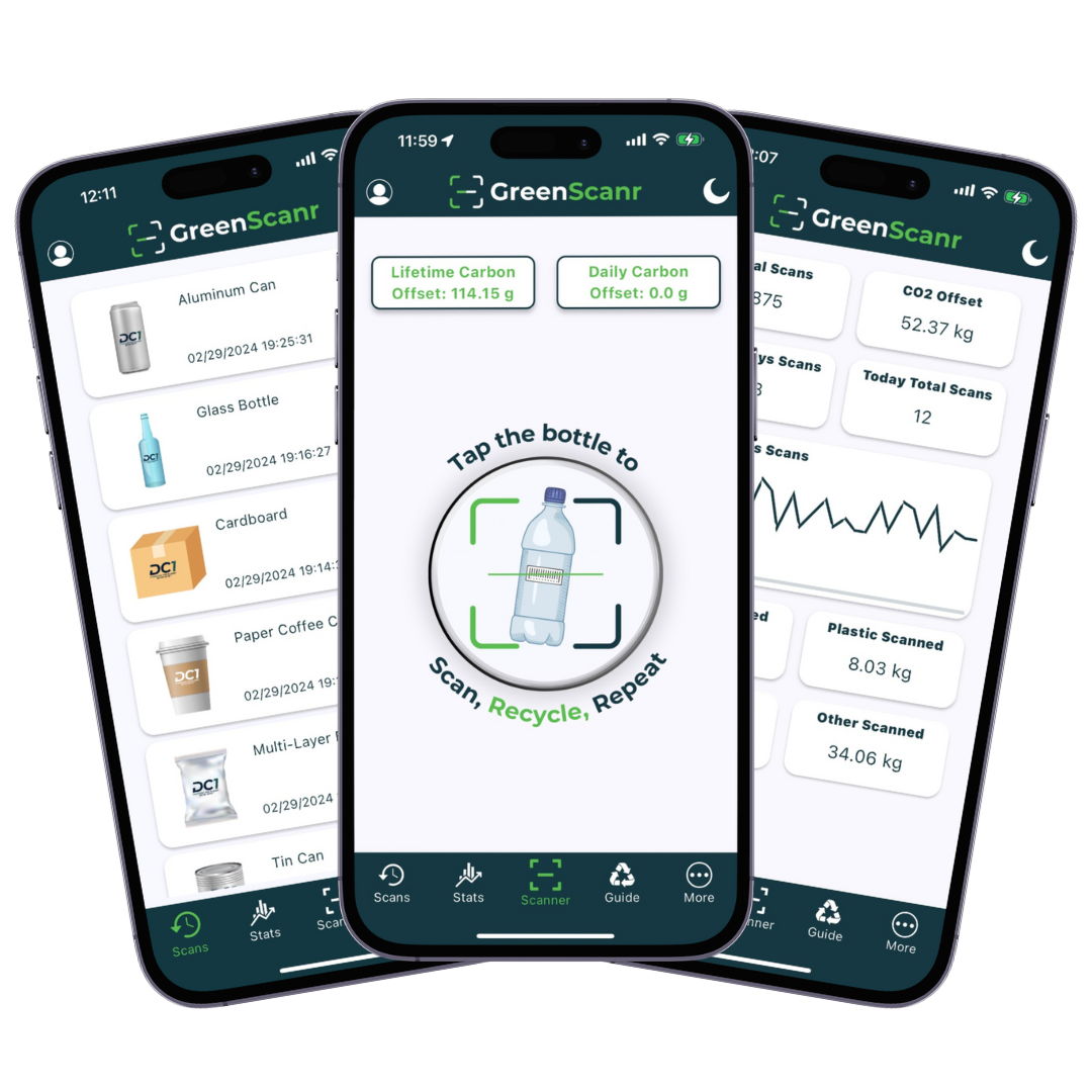 Scan, recycle, repeat! Utilize our GreenScanr app to track materials, weight, carbon offset and more. Work your way through the ranks and gain points competing with other scanners globally.